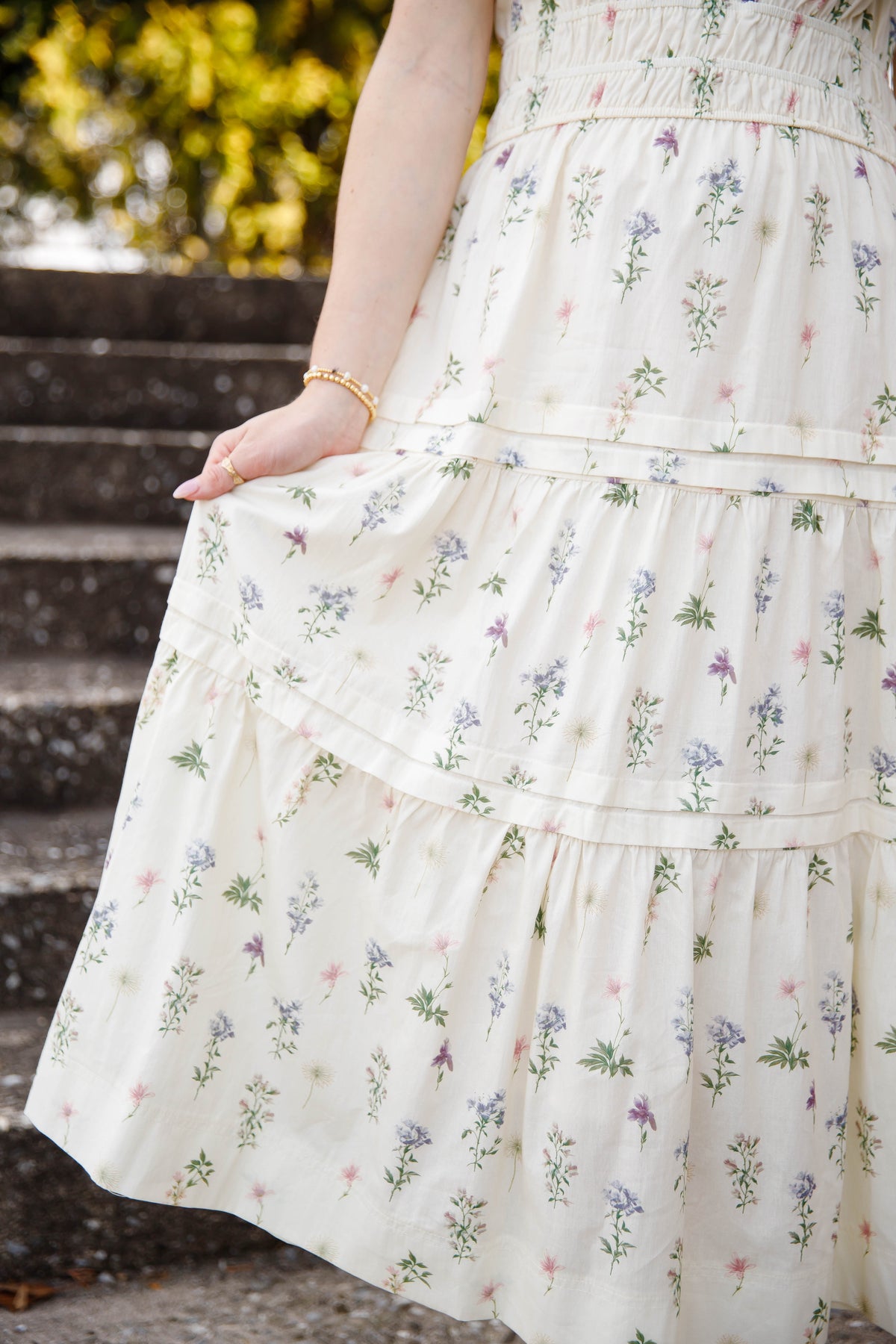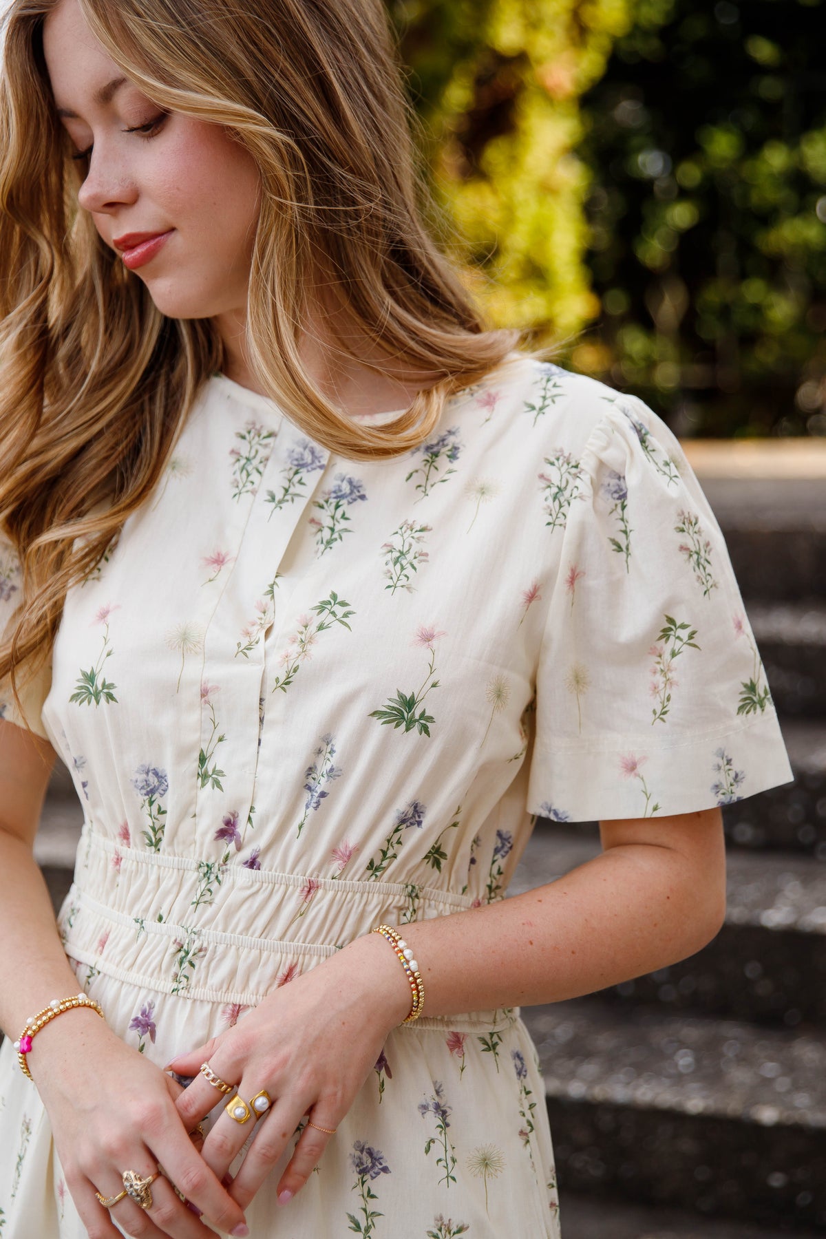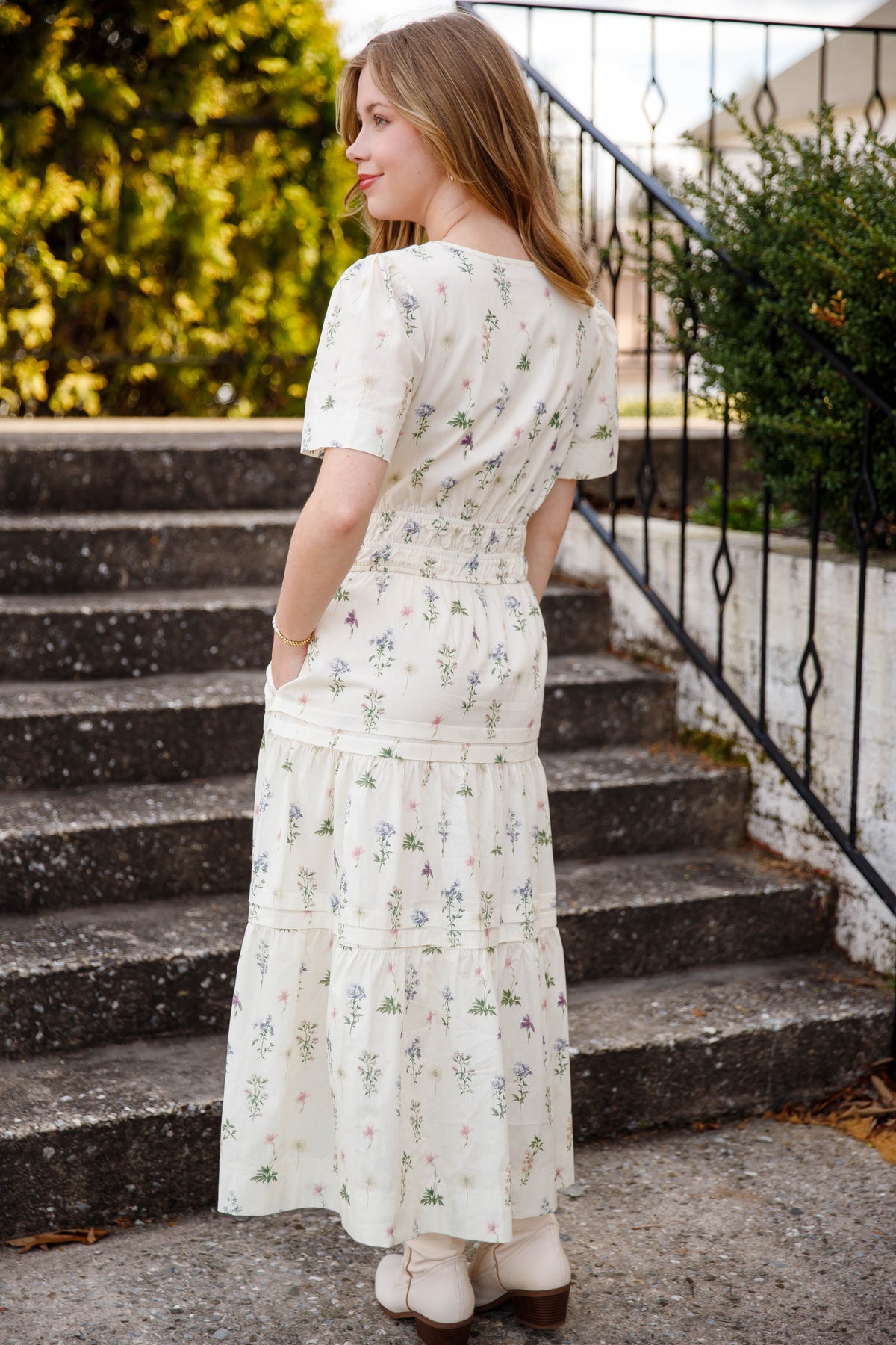 This cream floral tiered midi dress is a beautiful staple for spring and summer styling. Designed with a classic v-neck and short sleeves, this dress also features an elastic smocked waistband that gently defines the silhouette while offering all-day comfort.